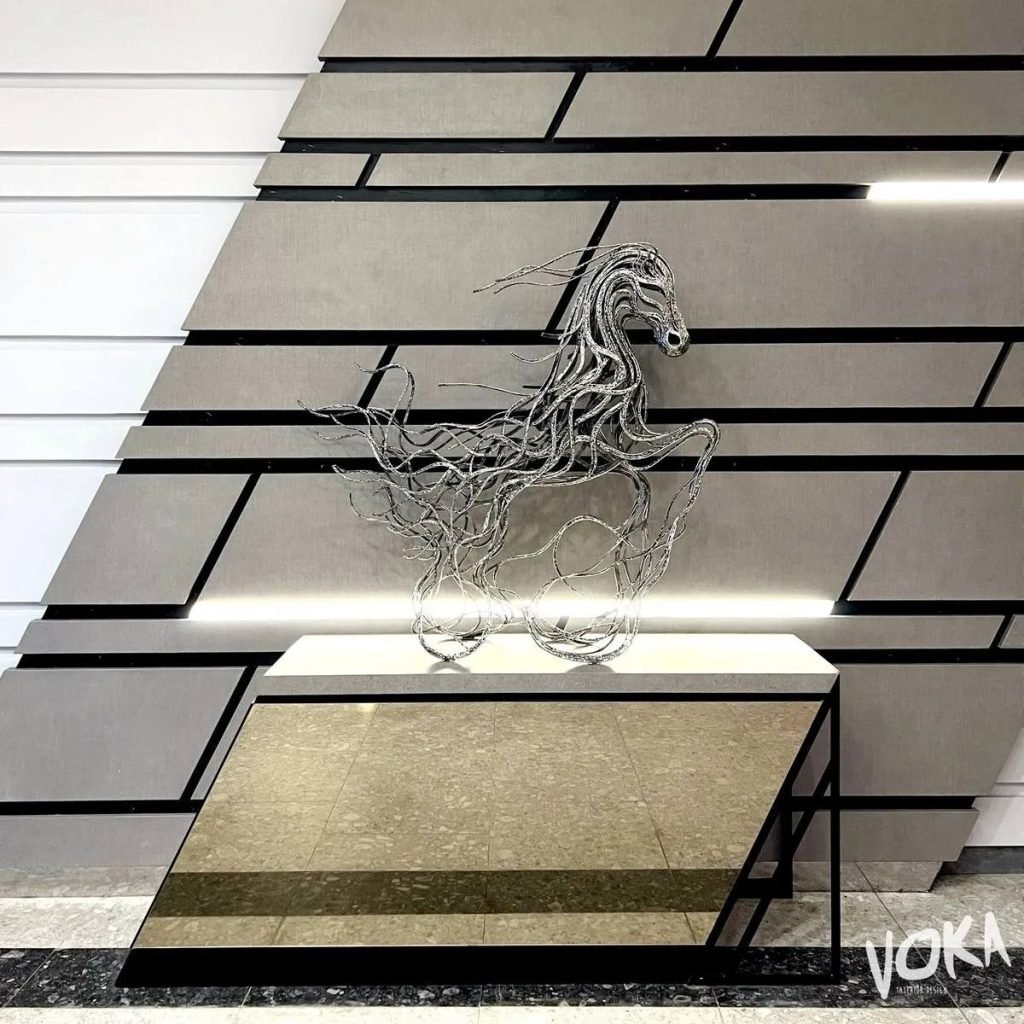 The sculpture, with its sleek lines and polished finish, interacts beautifully with its surroundings, capturing light and creating dynamic reflections. Positioned as a central piece in its environment, it enhances the space with its blend of contemporary art and local inspiration.